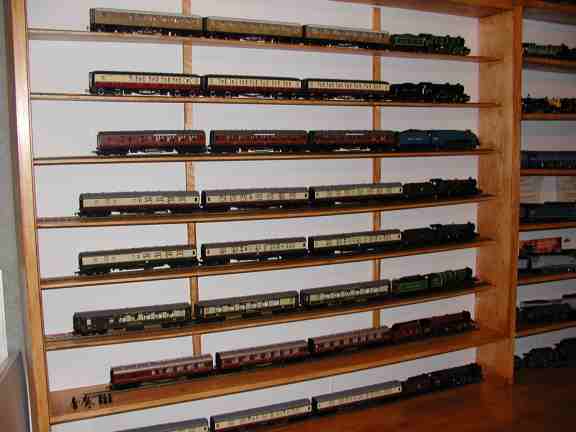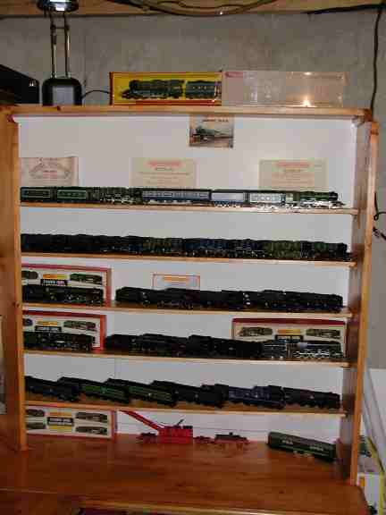 These pics go back to 2003 Long ago in a far away place.... When I had an area of the basement which was slowly being finished, this is where my layout was installed, and I constructed some display shelves in the same area to "show off" my collection. The shelves show my lack of skill when it comes to carpentry, but work just fine, they are all made out of pine that has been stained to look like oak!