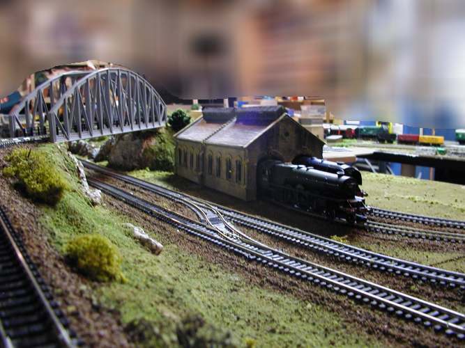 – 2 Locos wait on Shed - New Townstreet Double Engine Shed Closeup