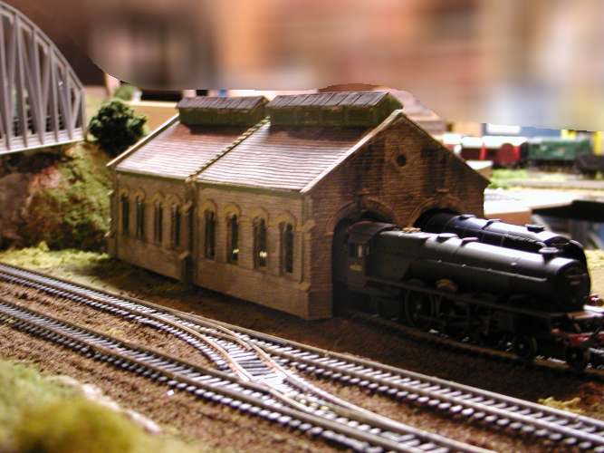 – 2 Locos wait on Shed - New Townstreet Double Engine Shed Closeup2